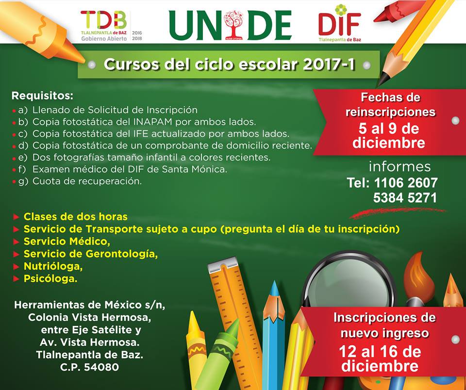 Archivo de la información, documento(s) o datos respectivos: UNIDE Volante para inscripción al ciclo escolar 2017-1.jpg Archivo de la información, documento(s) o datos respectivos (Enlace externo): Requisitos de inscripción para el ciclo escolar 2017 Fecha de actualización : 2018-08-03 14:20:44 Fecha de validación : 2021-08-25 16:06:05 Área o unidad administrativa responsable de la información :