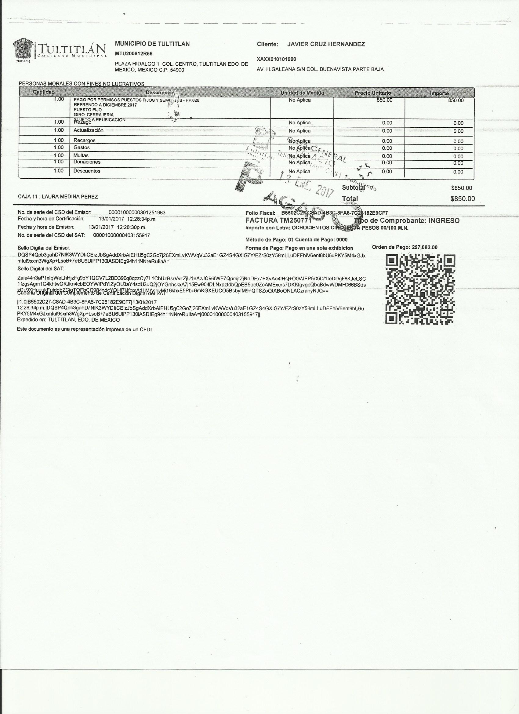 Archivo del documento: JAVIER CRUZ HERNÁNDEZ 001.jpg Monto total, bien, servicio y/o recurso aprovechado :