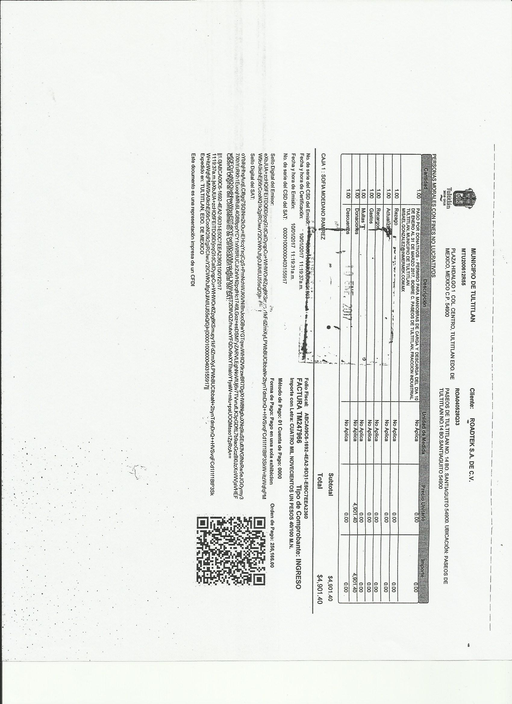 Archivo del documento: roadtek s.a. de c.v 001.jpg Monto total, bien, servicio y/o recurso aprovechado :