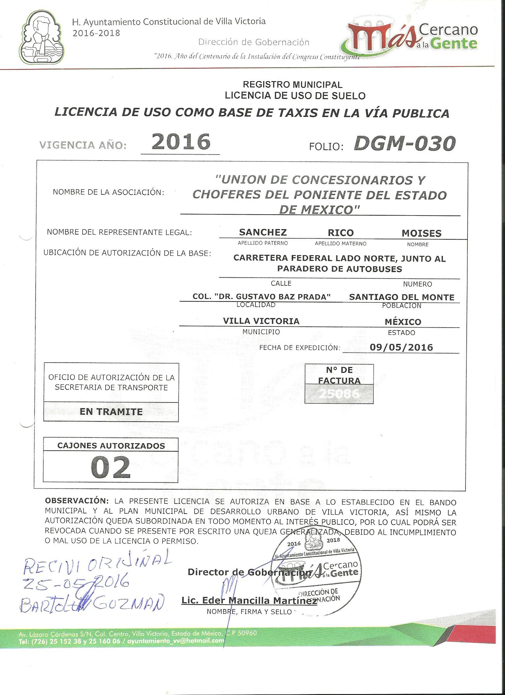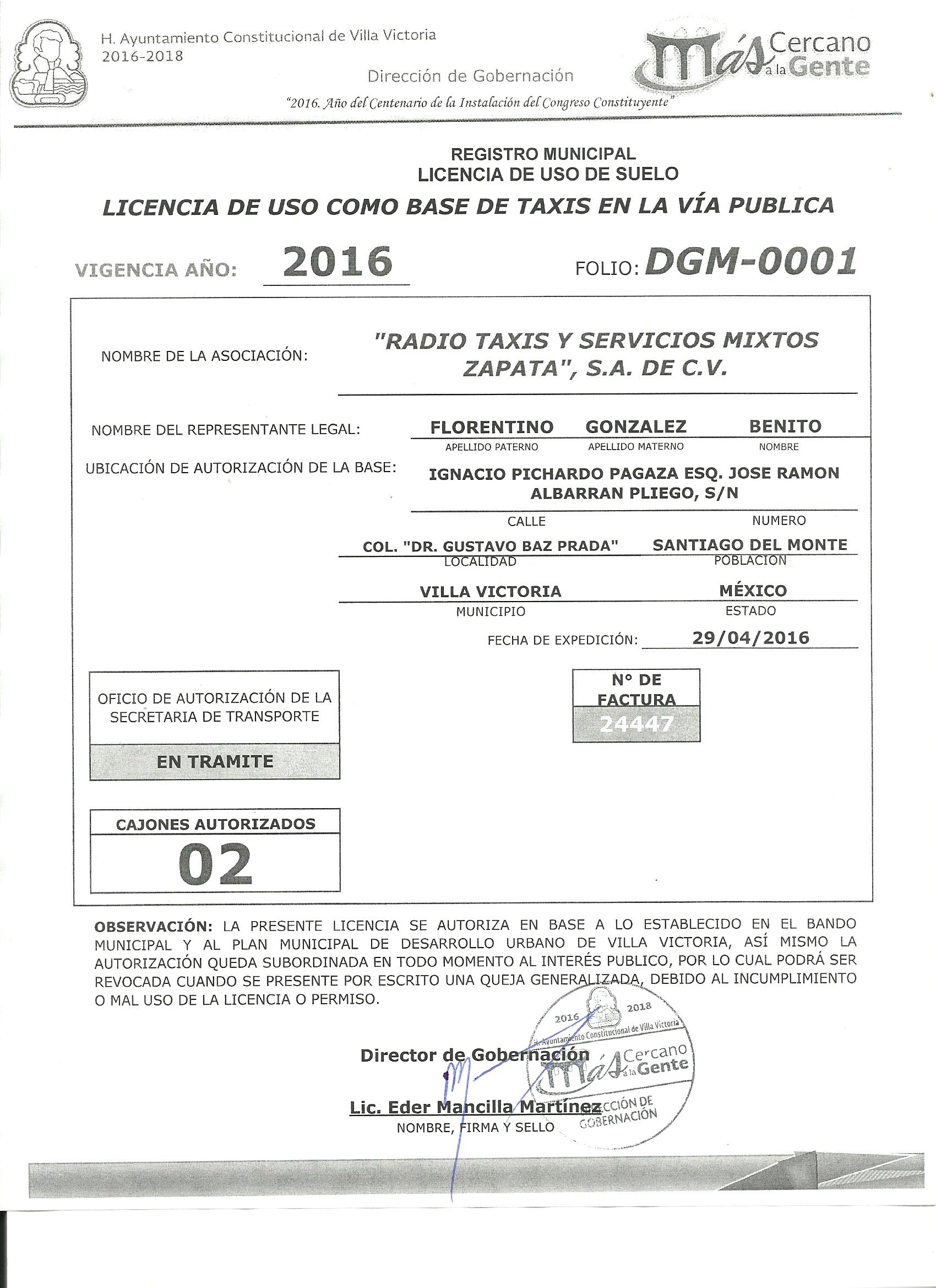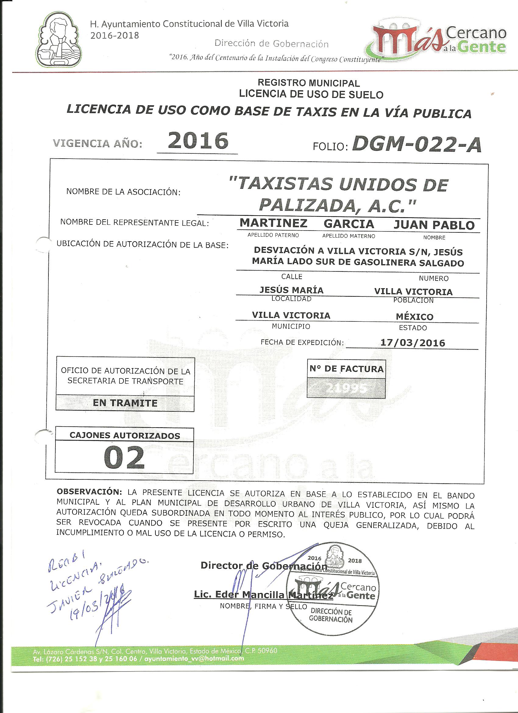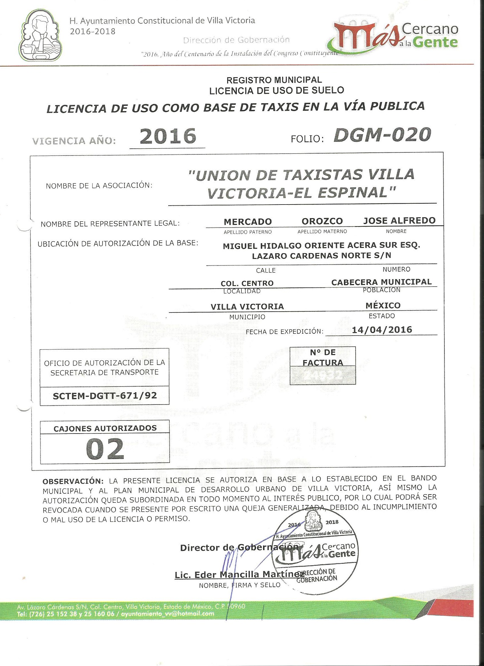 EXPEDICION DE LICENCIA DE USO COMO BASE DE TAXIS EN LA VÍA PUBLICA