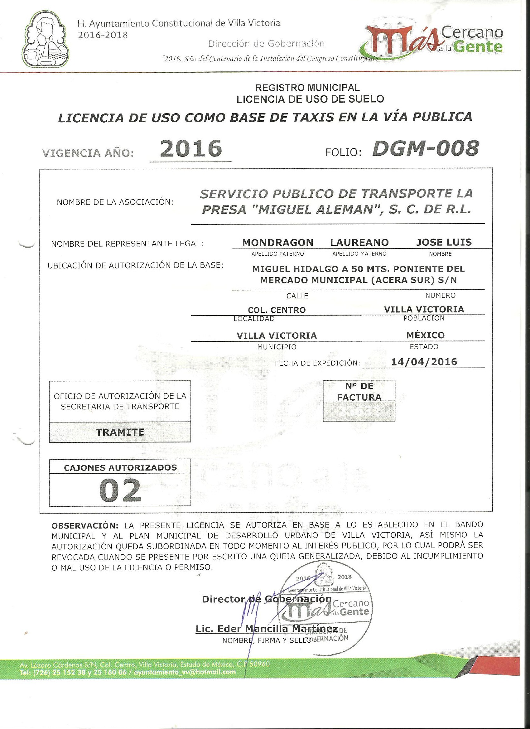 SOCIEDAD COOPERATIVA DENOMINADA SERVICIO PUBLICO DE TRANSPORTE LA PRESA MIGUEL ALEMAN S.C DE R.L.
