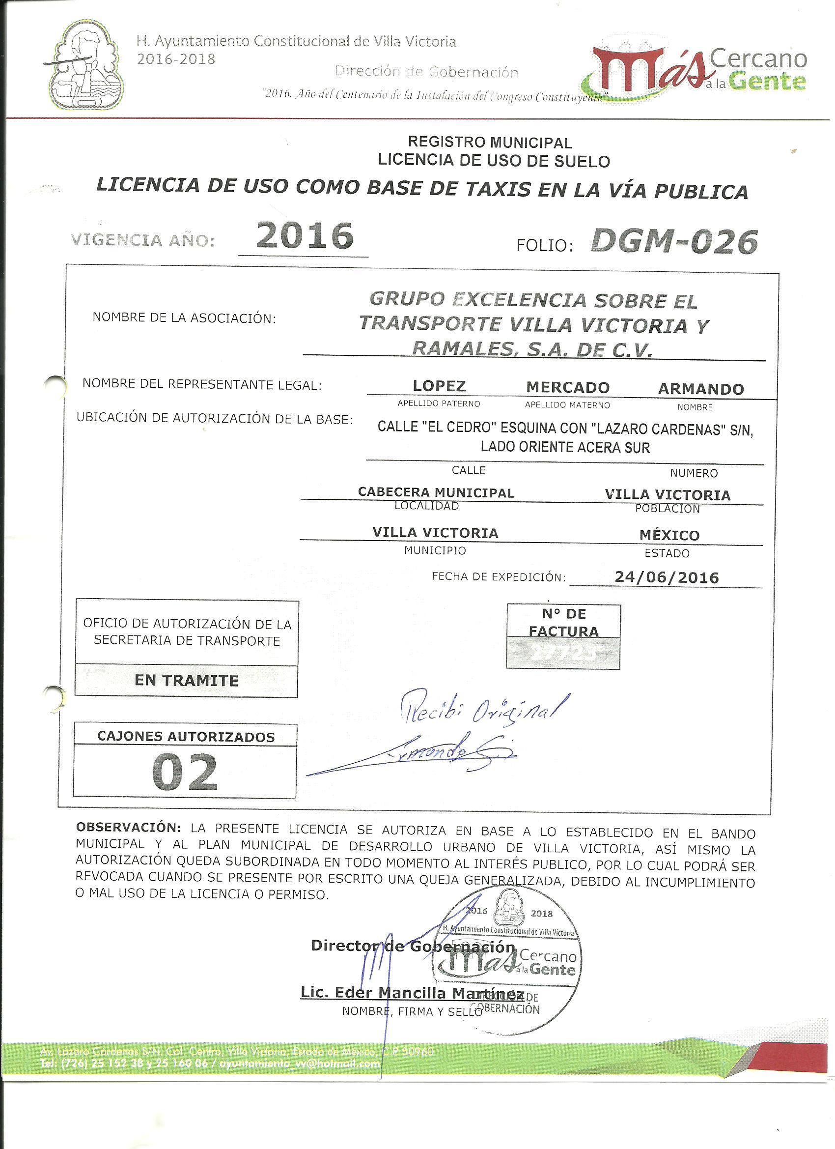 GRUPO EXCELENCIA SOBRE EL TRANSPORTE VILLA VICTORIA Y RAMALES, S.A. DE C.V.