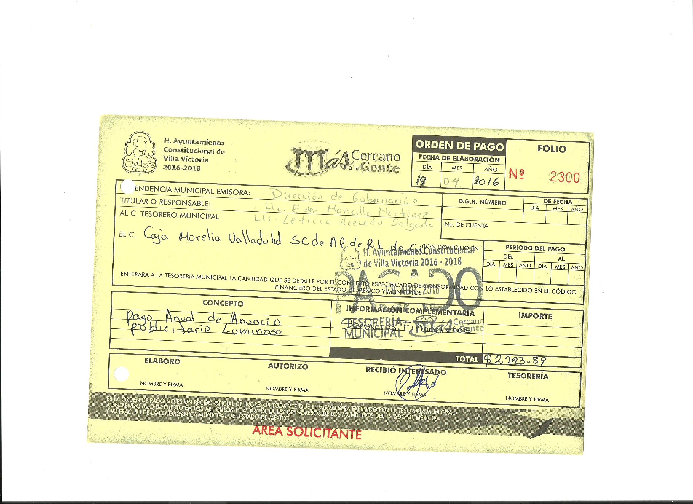 Archivo del documento: ANUNCIO 019.jpg Monto total, bien, servicio y/o recurso aprovechado :
